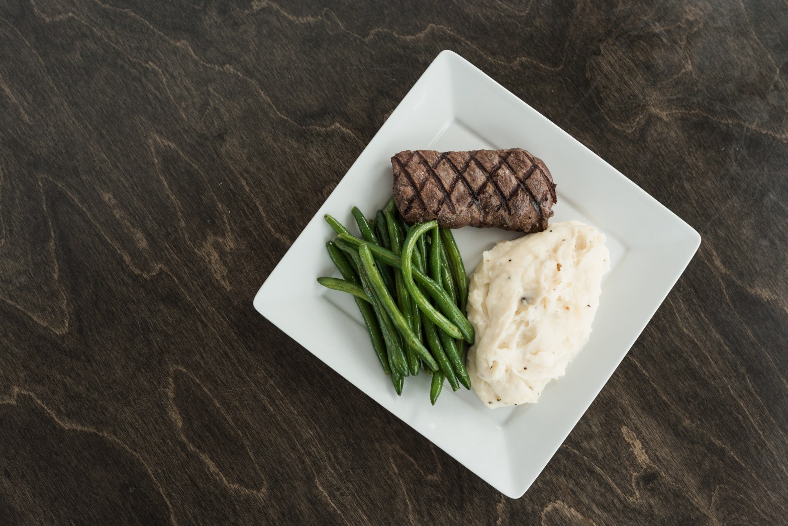 Premium 8 oz. grilled top sirloin steak with fries (or mashed potatoes) and green beans