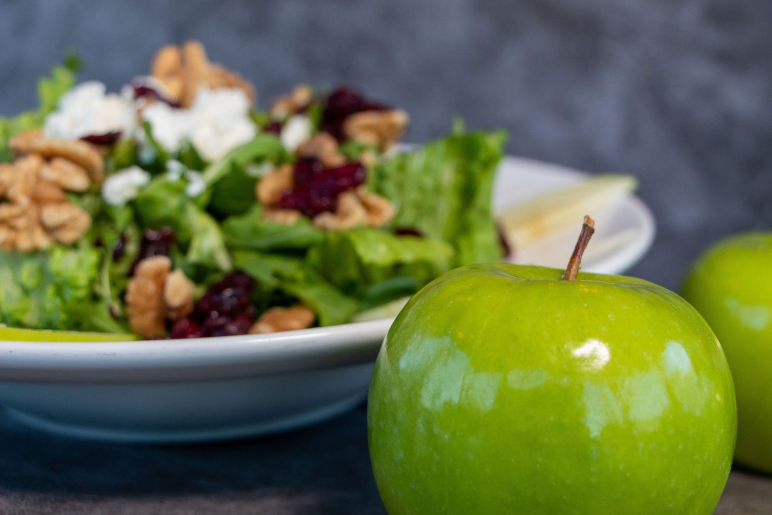 Iceberg, romaine, arugula, walnuts, green apples, feta cheese, and dried cranberries with herb vinaigrette on the side